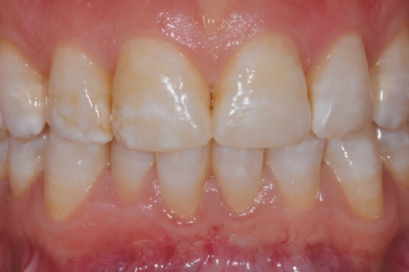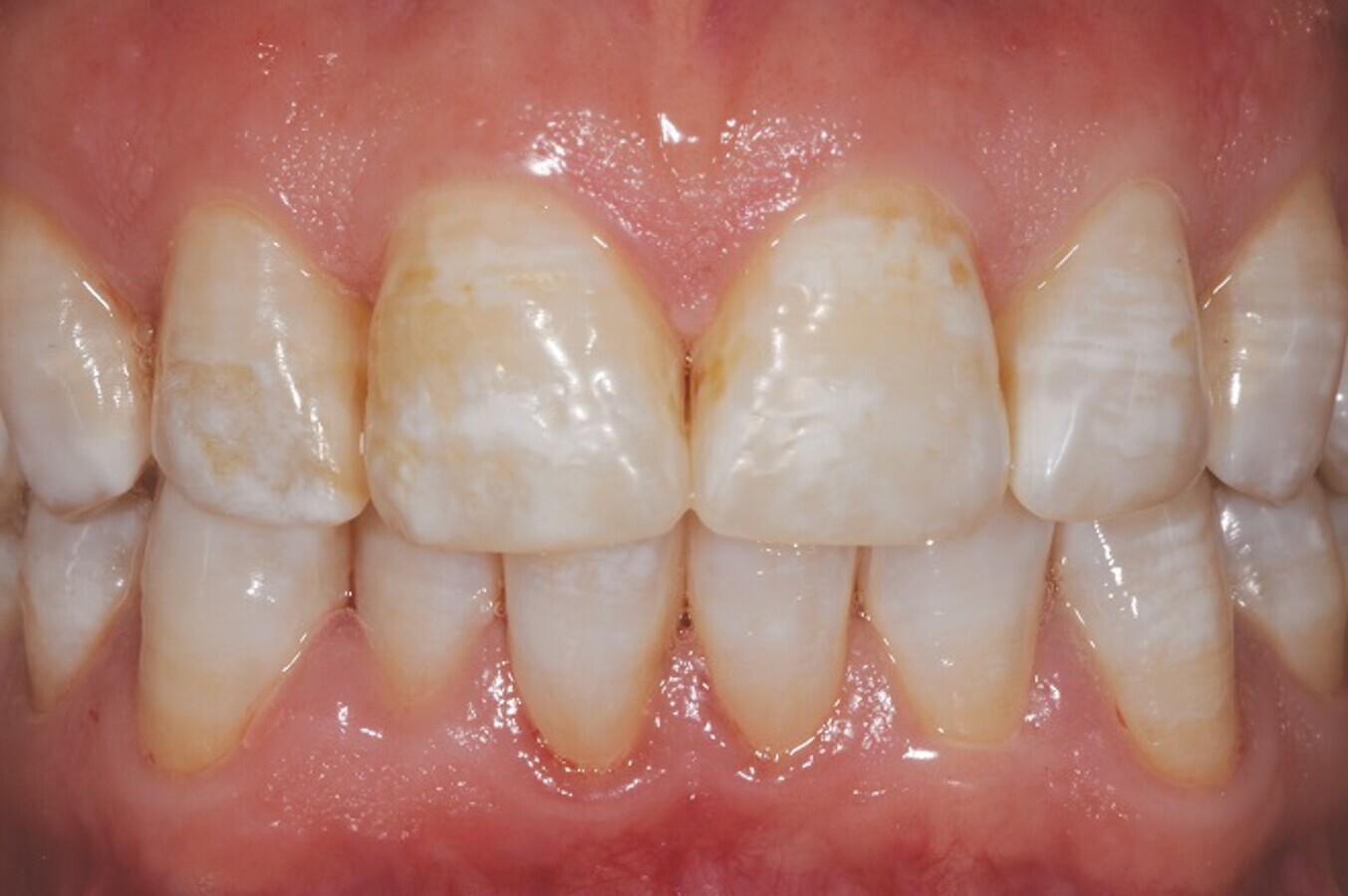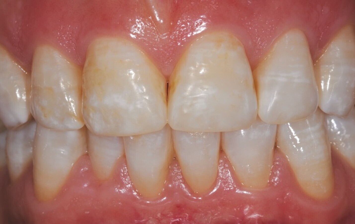 Kljub temu so bili najboljši rezultati doseženi in vivo. V obravnavanem kliničnem primeru je bil namen 37-letne ženske pri obisku zobozdravnika, da bi izboljšala videz svojega nasmeha. Po temeljiti anamnezi in pravilni diagnozi zobne fluoroze (slika 1) je prejela remineralizirajoče zdravljenje na osnovi F-ACP (Biosmalto Mousse Caries, Abrasion & Erosion), ki ga je nanašala v posamezne termoformirane nastavke in uporabljala dvakrat na dan po 20 minut. Svetoval sem ji tudi, naj si v naslednji uri po uporabi pene ne izpira ust, ne pije, ne zaužije hrane in ne kadi. Pacientko smo prosili, naj nastavke dosledno uporablja, vsakih 30 dni hodi na preglede in zdravljenje dopolni z remineralizirajočo zobno pasto Biosmalto Caries, Abrasion & Erosion ter zobno ščetko z mehkimi ščetinami Curasept Soft 012 z Bassovo tehniko ščetkanja.